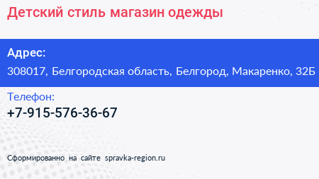 Детский стиль, магазин одежды по адресу 308017, Белгородская область, Белгород, Макаренко, 32Б в дальнейшем Организация, размещена в следующих категориях: