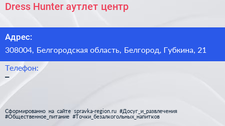 Dress Hunter, аутлет-центр по адресу 308004, Белгородская область, Белгород, Губкина, 21 в дальнейшем Организация, размещена в следующих категориях: