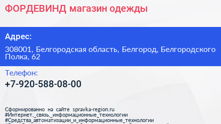 ФОРДЕВИНД, магазин одежды по адресу 308001, Белгородская область, Белгород, Белгородского Полка, 62 в дальнейшем Организация, размещена в следующих категориях: