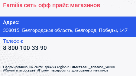 Familia, сеть офф-прайс магазинов по адресу 308015, Белгородская область, Белгород, Победы, 147 в дальнейшем Организация, размещена в следующих категориях: