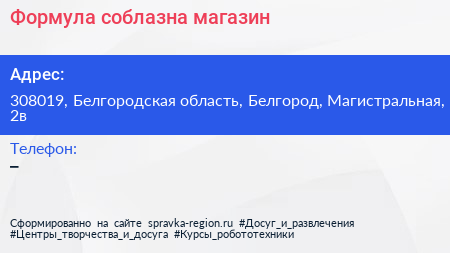 Формула соблазна, магазин по адресу 308019, Белгородская область, Белгород, Магистральная, 2в в дальнейшем Организация, размещена в следующих категориях: