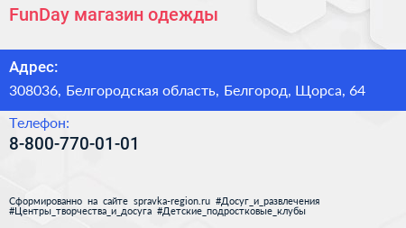 FunDay, магазин одежды по адресу 308036, Белгородская область, Белгород, Щорса, 64 в дальнейшем Организация, размещена в следующих категориях: