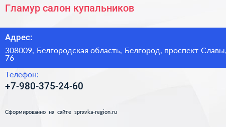 Гламур, салон купальников по адресу 308009, Белгородская область, Белгород, проспект Славы, 76 в дальнейшем Организация, размещена в следующих категориях: