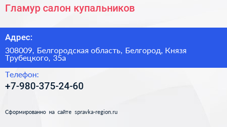 Гламур, салон купальников по адресу 308009, Белгородская область, Белгород, Князя Трубецкого, 35а в дальнейшем Организация, размещена в следующих категориях: