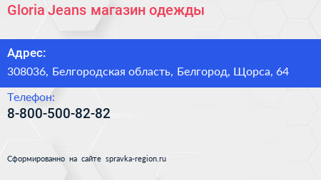Gloria Jeans, магазин одежды по адресу 308036, Белгородская область, Белгород, Щорса, 64 в дальнейшем Организация, размещена в следующих категориях: