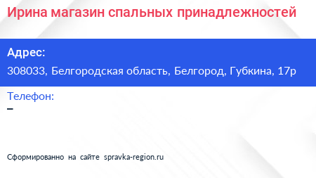 Ирина, магазин спальных принадлежностей по адресу 308033, Белгородская область, Белгород, Губкина, 17р в дальнейшем Организация, размещена в следующих категориях: