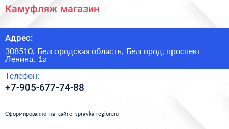 Камуфляж, магазин по адресу 308510, Белгородская область, Белгород, проспект Ленина, 1а в дальнейшем Организация, размещена в следующих категориях: