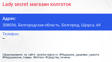 Lady secret, магазин колготок по адресу 308036, Белгородская область, Белгород, Щорса, 64 в дальнейшем Организация, размещена в следующих категориях: