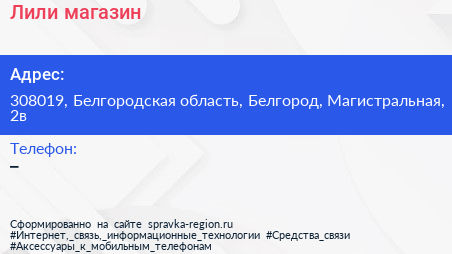 Лили, магазин по адресу 308019, Белгородская область, Белгород, Магистральная, 2в в дальнейшем Организация, размещена в следующих категориях: