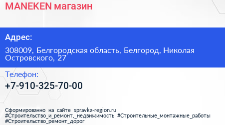 MANEKEN, магазин по адресу 308009, Белгородская область, Белгород, Николая Островского, 27 в дальнейшем Организация, размещена в следующих категориях: