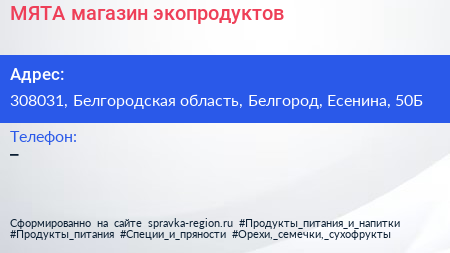 МЯТА, магазин экопродуктов по адресу 308031, Белгородская область, Белгород, Есенина, 50Б в дальнейшем Организация, размещена в следующих категориях: