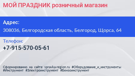 МОЙ ПРАЗДНИК, розничный магазин по адресу 308036, Белгородская область, Белгород, Щорса, 64 в дальнейшем Организация, размещена в следующих категориях: