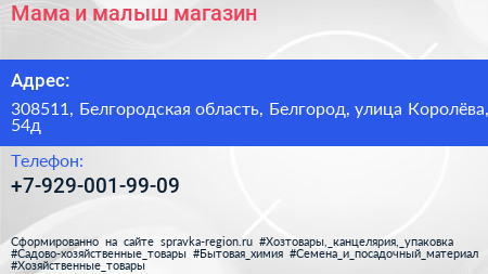 Мама и малыш, магазин по адресу 308511, Белгородская область, Белгород, улица Королёва, 54д в дальнейшем Организация, размещена в следующих категориях: