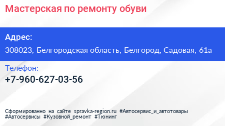Мастерская по ремонту обуви по адресу 308023, Белгородская область, Белгород, Садовая, 61а в дальнейшем Организация, размещена в следующих категориях: