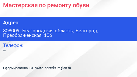 Мастерская по ремонту обуви по адресу 308009, Белгородская область, Белгород, Преображенская, 106 в дальнейшем Организация, размещена в следующих категориях:
