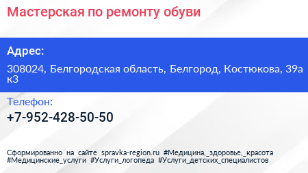 Мастерская по ремонту обуви по адресу 308024, Белгородская область, Белгород, Костюкова, 39а к3 в дальнейшем Организация, размещена в следующих категориях: