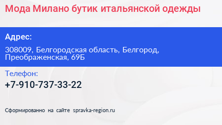 Мода Милано, бутик итальянской одежды по адресу 308009, Белгородская область, Белгород, Преображенская, 69Б в дальнейшем Организация, размещена в следующих категориях: