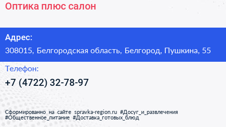 Оптика-плюс, салон по адресу 308015, Белгородская область, Белгород, Пушкина, 55 в дальнейшем Организация, размещена в следующих категориях: