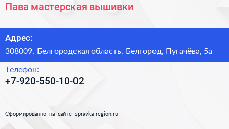 Пава, мастерская вышивки по адресу 308009, Белгородская область, Белгород, Пугачёва, 5а в дальнейшем Организация, размещена в следующих категориях: