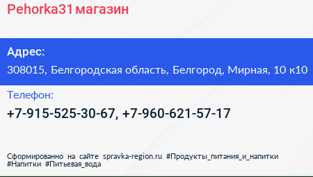 Pehorka31, магазин по адресу 308015, Белгородская область, Белгород, Мирная, 10 к10 в дальнейшем Организация, размещена в следующих категориях: