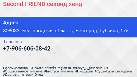 Second FRIEND, секонд-хенд по адресу 308033, Белгородская область, Белгород, Губкина, 17и в дальнейшем Организация, размещена в следующих категориях: