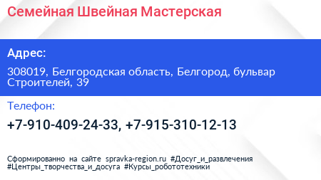 Семейная Швейная Мастерская по адресу 308019, Белгородская область, Белгород, бульвар Строителей, 39 в дальнейшем Организация, размещена в следующих категориях: