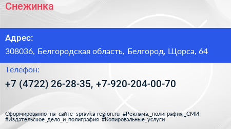 Снежинка по адресу 308036, Белгородская область, Белгород, Щорса, 64 в дальнейшем Организация, размещена в следующих категориях: