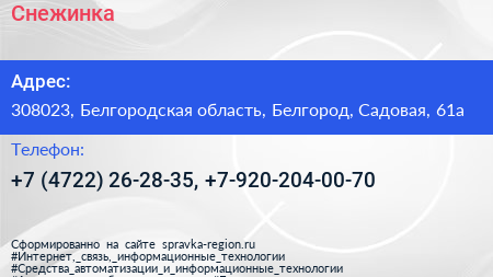 Снежинка по адресу 308023, Белгородская область, Белгород, Садовая, 61а в дальнейшем Организация, размещена в следующих категориях: