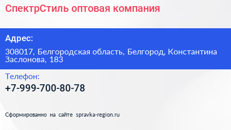 СпектрСтиль, оптовая компания по адресу 308017, Белгородская область, Белгород, Константина Заслонова, 183 в дальнейшем Организация, размещена в следующих категориях: