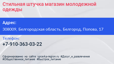 Стильная штучка, магазин молодежной одежды по адресу 308009, Белгородская область, Белгород, Попова, 17 в дальнейшем Организация, размещена в следующих категориях: