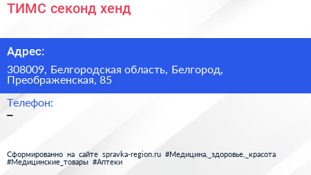 ТИМС, секонд-хенд по адресу 308009, Белгородская область, Белгород, Преображенская, 85 в дальнейшем Организация, размещена в следующих категориях: