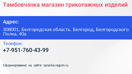 Тамбовчанка, магазин трикотажных изделий по адресу 308001, Белгородская область, Белгород, Белгородского Полка, 40а в дальнейшем Организация, размещена в следующих категориях:
