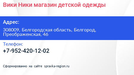 Вики Ники, магазин детской одежды по адресу 308009, Белгородская область, Белгород, Преображенская, 46 в дальнейшем Организация, размещена в следующих категориях: