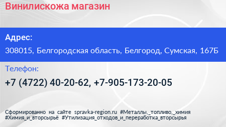 Винилискожа, магазин по адресу 308015, Белгородская область, Белгород, Сумская, 167Б в дальнейшем Организация, размещена в следующих категориях: