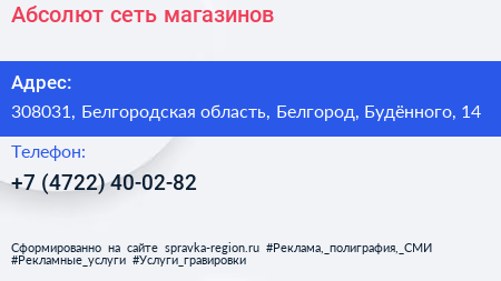 Абсолют, сеть магазинов по адресу 308031, Белгородская область, Белгород, Будённого, 14 в дальнейшем Организация, размещена в следующих категориях: