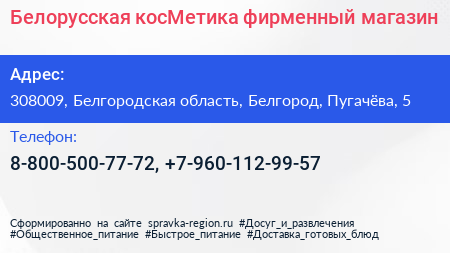 Белорусская косМетика, фирменный магазин по адресу 308009, Белгородская область, Белгород, Пугачёва, 5 в дальнейшем Организация, размещена в следующих категориях: