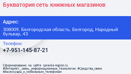 Букватория, сеть книжных магазинов по адресу 308009, Белгородская область, Белгород, Народный бульвар, 43 в дальнейшем Организация, размещена в следующих категориях: