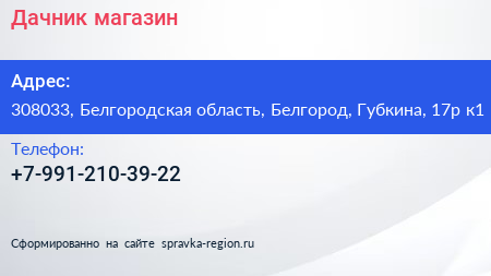 Дачник, магазин по адресу 308033, Белгородская область, Белгород, Губкина, 17р к1 в дальнейшем Организация, размещена в следующих категориях: