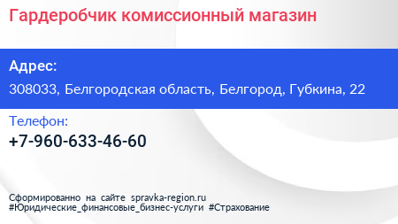 Гардеробчик, комиссионный магазин по адресу 308033, Белгородская область, Белгород, Губкина, 22 в дальнейшем Организация, размещена в следующих категориях: