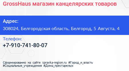 GrossHaus, магазин канцелярских товаров по адресу 308024, Белгородская область, Белгород, 5 Августа, 4 в дальнейшем Организация, размещена в следующих категориях: