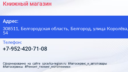 Книжный магазин по адресу 308511, Белгородская область, Белгород, улица Королёва, 54 в дальнейшем Организация, размещена в следующих категориях: