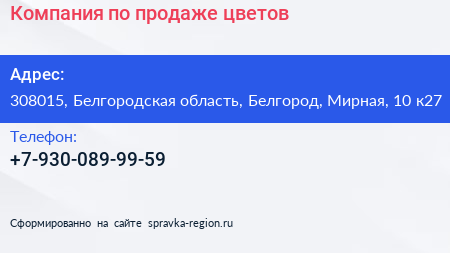 Компания по продаже цветов по адресу 308015, Белгородская область, Белгород, Мирная, 10 к27 в дальнейшем Организация, размещена в следующих категориях: