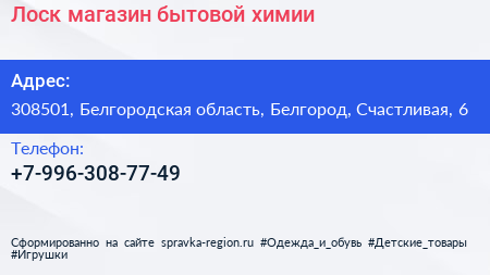 Лоск, магазин бытовой химии по адресу 308501, Белгородская область, Белгород, Счастливая, 6 в дальнейшем Организация, размещена в следующих категориях: