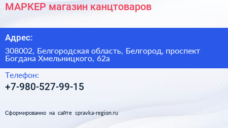 МАРКЕР, магазин канцтоваров по адресу 308002, Белгородская область, Белгород, проспект Богдана Хмельницкого, 62а в дальнейшем Организация, размещена в следующих категориях: