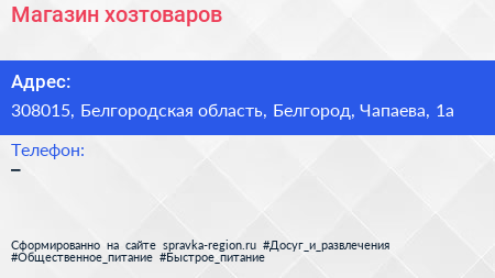 Магазин хозтоваров по адресу 308015, Белгородская область, Белгород, Чапаева, 1а в дальнейшем Организация, размещена в следующих категориях: