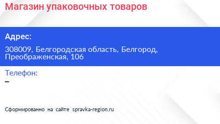 Магазин упаковочных товаров по адресу 308009, Белгородская область, Белгород, Преображенская, 106 в дальнейшем Организация, размещена в следующих категориях: