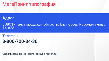 МегаПринт, типография по адресу 308017, Белгородская область, Белгород, Рабочая улица, 14 к26 в дальнейшем Организация, размещена в следующих категориях: