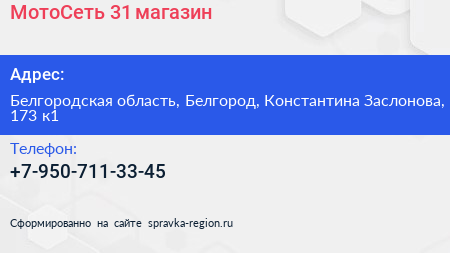 МотоСеть 31, магазин по адресу Белгородская область, Белгород, Константина Заслонова, 173 к1 в дальнейшем Организация, размещена в следующих категориях: