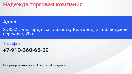 Надежда, торговая компания по адресу 308002, Белгородская область, Белгород, 5-й Заводской переулок, 28в в дальнейшем Организация, размещена в следующих категориях: