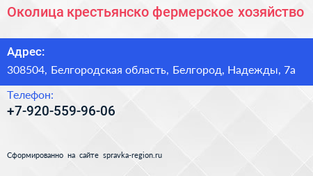 Околица, крестьянско-фермерское хозяйство по адресу 308504, Белгородская область, Белгород, Надежды, 7а в дальнейшем Организация, размещена в следующих категориях: